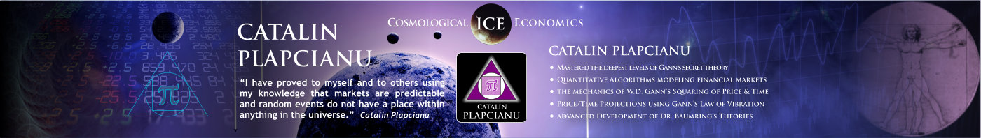 The Institute of Cosmological Economics is proud to support the advanced research of Catalin Plapcianu - an engineer, mathematician and market analyst who brings original and sophisticated insights to technical analysis through the integration of scientific and mathematical principles with the most refined elements of Gann analysis. He develops complex algorithms distilling advanced Gann insights into algorithmic logic which is then used to generate automated forecasting and trading systems.